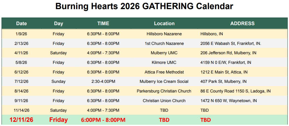 We have a “Gathering” each month where we come together to fellowship, praise God in song , pray, and partake of communion. We also have a 4th day speaker who provides some thoughts on their 4th day experience. We usually meet on the 2nd Friday evening of the month. However, on months where we have a walk or flight, we usually gather on the Friday evening after the walk/flight weekend. The Gatherings take place at each month at a different host church throughout the community.